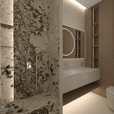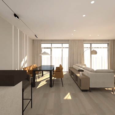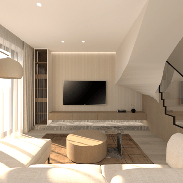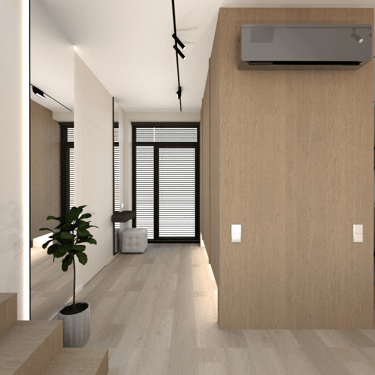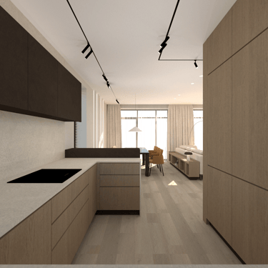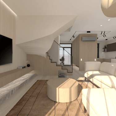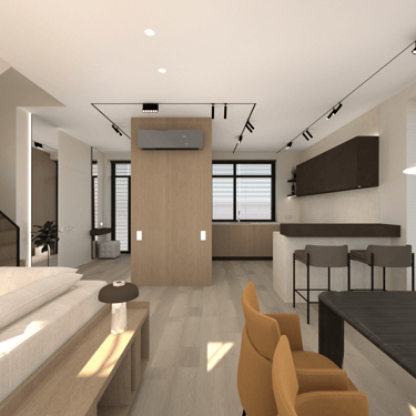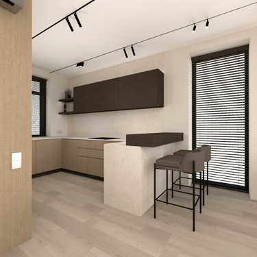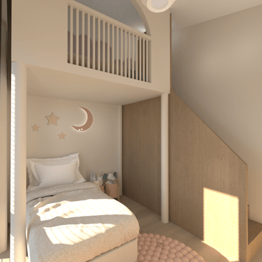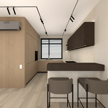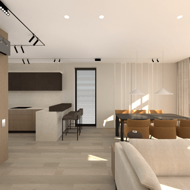 Jaunos šeimos būsto įrengimas. Gyvenamasis dviejų aukštų namas su atskiromis suaugusiųjų ir mažylių erdvėmis, individualiais san. mazgais. Erdvi svetainės erdvė jaukiems šeimos susitikimams bei patogi ergonimiška virtuvė.